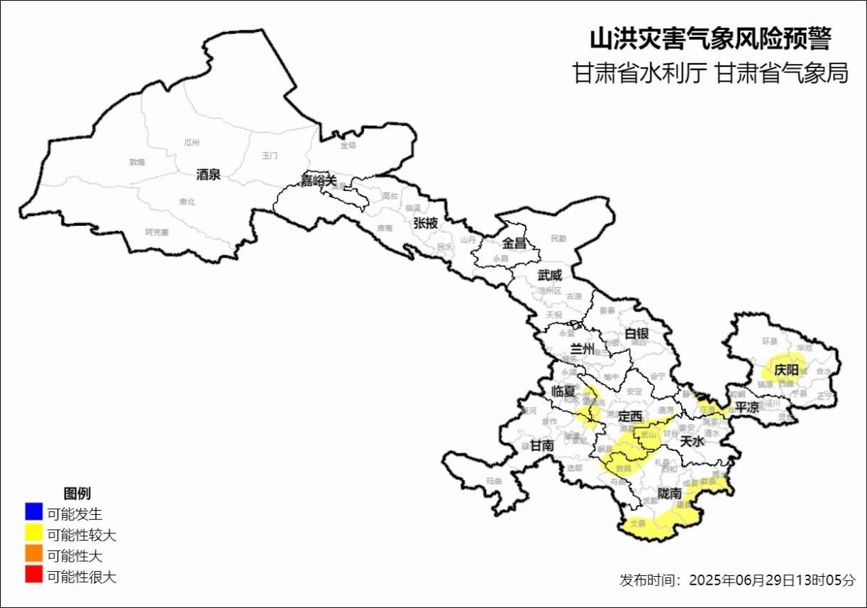 根據(jù)省氣象局《重大氣象信息專報(bào)》(2025年甘氣第10期),未來(lái)十天甘肅省多降水天氣,具有對(duì)流性強(qiáng)、小時(shí)雨強(qiáng)大、累積雨量大等特點(diǎn),洪水災(zāi)害風(fēng)險(xiǎn)高。6月29日13時(shí),省水利廳、省氣象局聯(lián)合發(fā)布山洪災(zāi)害氣象風(fēng)險(xiǎn)預(yù)警:預(yù)計(jì),6月29日14時(shí)至30日14時(shí),白銀市(景泰縣),武威市(古浪縣),定西市(臨洮縣、渭源縣、通渭縣、隴西縣、漳縣、岷縣),臨夏州(廣河縣、東鄉(xiāng)縣、康樂縣),甘南州(臨潭縣、卓尼縣、舟曲縣、迭部縣),天水市(秦安縣、甘谷縣、武山縣、張家川縣),隴南市(宕縣、禮縣、武都區(qū)、成縣、文縣、康縣、徽縣、兩當(dāng)縣),平?jīng)鍪校o寧縣、崆峒區(qū)、華亭市、莊浪縣),慶陽(yáng)市(西峰區(qū)、慶城縣、環(huán)縣、華池縣、鎮(zhèn)原縣)等地區(qū)發(fā)生山洪災(zāi)害可能性較大(黃色預(yù)警)。