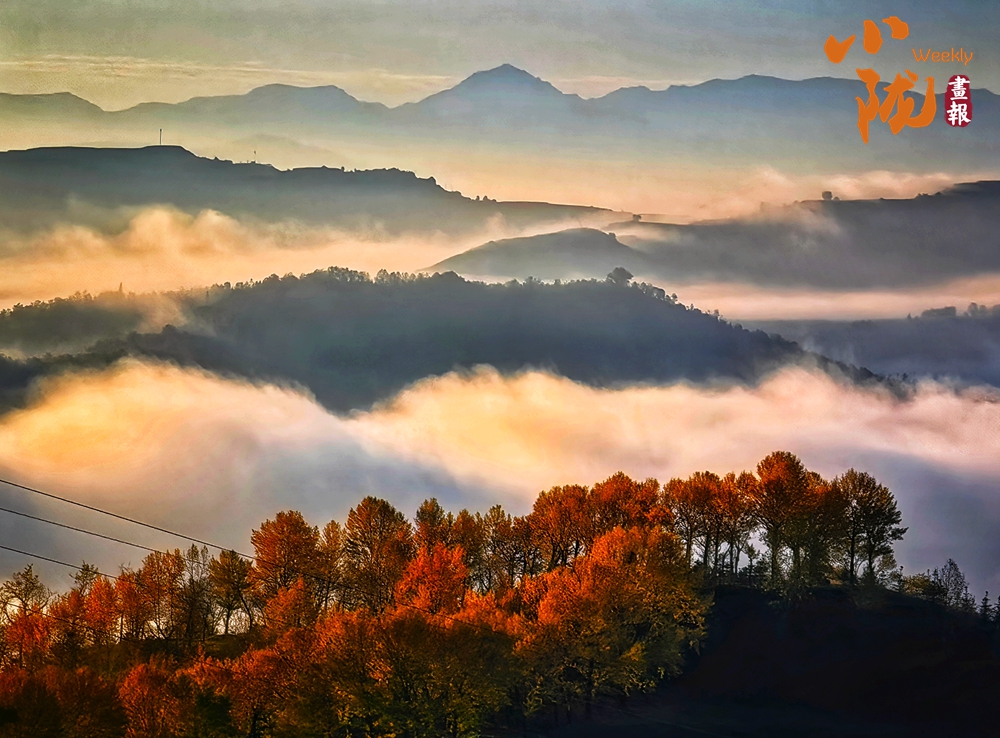 仿佛一夜之間,大北山被染成了暖黃色。極目遠(yuǎn)眺,云海漫過蒼翠的山脊,與天邊燃燒的晚霞交融成流動(dòng)的錦緞,夢(mèng)幻般的色彩恣意鋪張,金色與藍(lán)天、山坳交織在一起,格外溫馨浪漫。