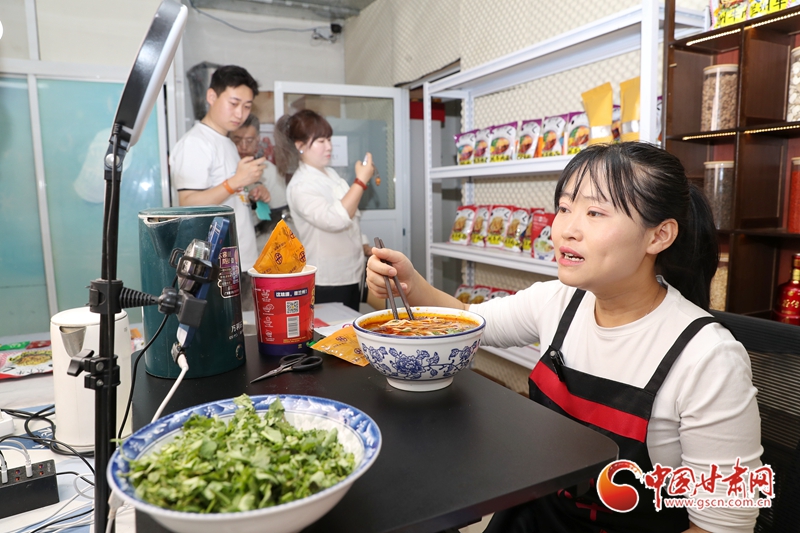 在蘭州科盛食品有限公司直播間主播正在線上銷(xiāo)售蘭州牛肉拉面